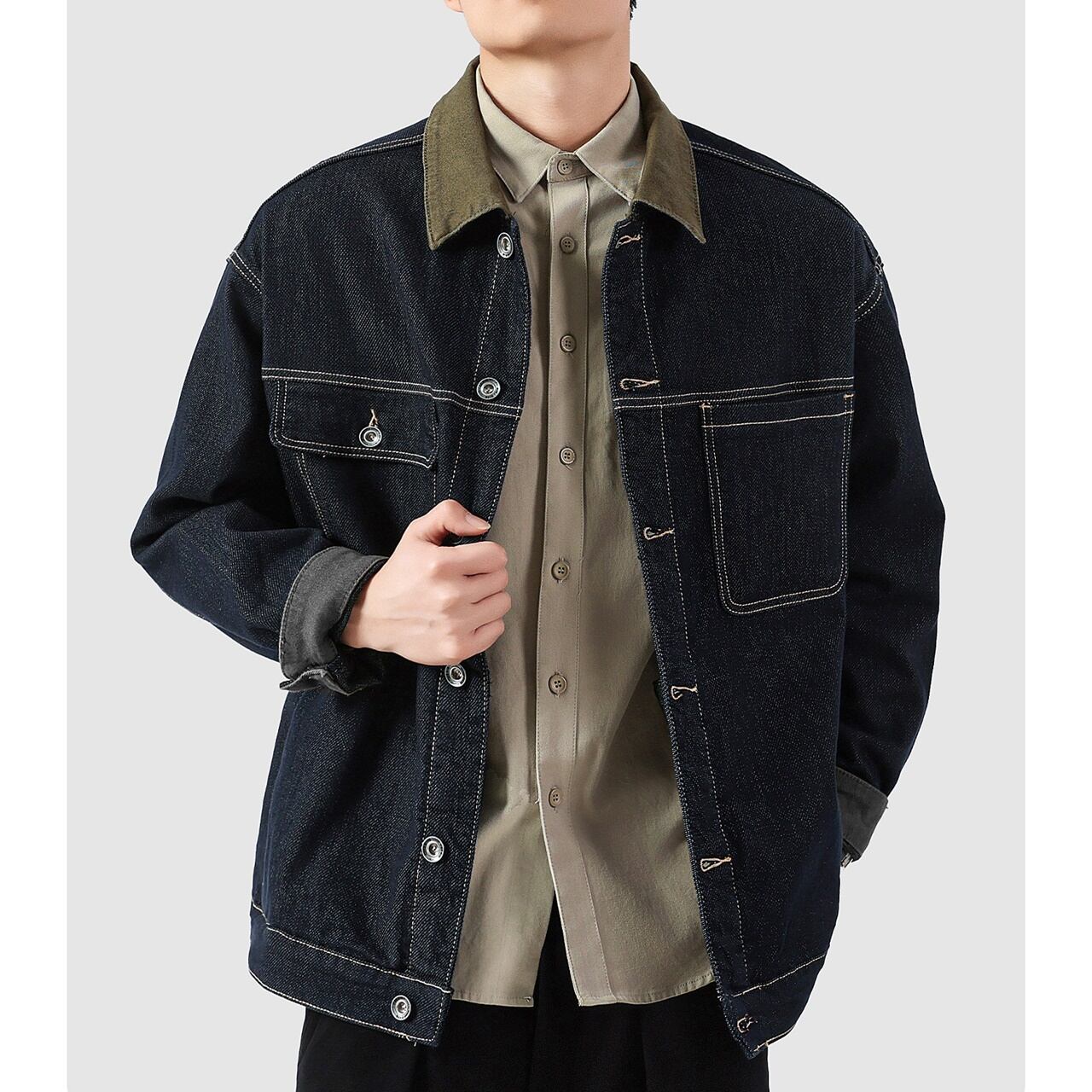 ◇カラー 【A】カーキ襟 【B】ダークブルー襟 【C】ダークブルー襟(裏起毛) オプションで裏起毛選択(+2,000円) ◇サイズ M 肩幅:54cm / 胸囲:113cm / 着丈:70.2cm / 袖丈:55.9cm L 肩幅:55.2cm / 胸囲:117.5cm / 着丈:71.1cm / 袖丈:56.5cm XL 肩幅:56.5cm / 胸囲:121.9cm / 着丈:72.1cm / 袖丈:57.2cm 2XL 肩幅:57.8cm / 胸囲:126.4cm / 着丈:71cm / 袖丈:57.8cm 3XL 肩幅:59.1cm / 胸囲:130.8cm / 着丈:73cm / 袖丈:58.4cm 4XL 肩幅:60.3cm / 胸囲:135.3cm / 着丈:75cm / 袖丈:59.1cm ◇素材 コットン ◇モデル 身長:175cm、体重65kg、Lサイズ着用