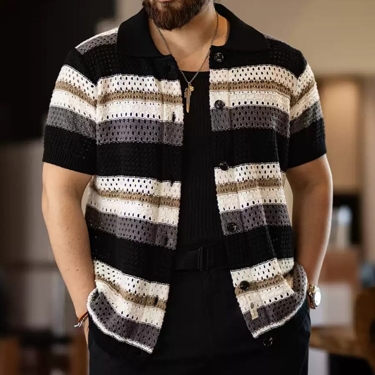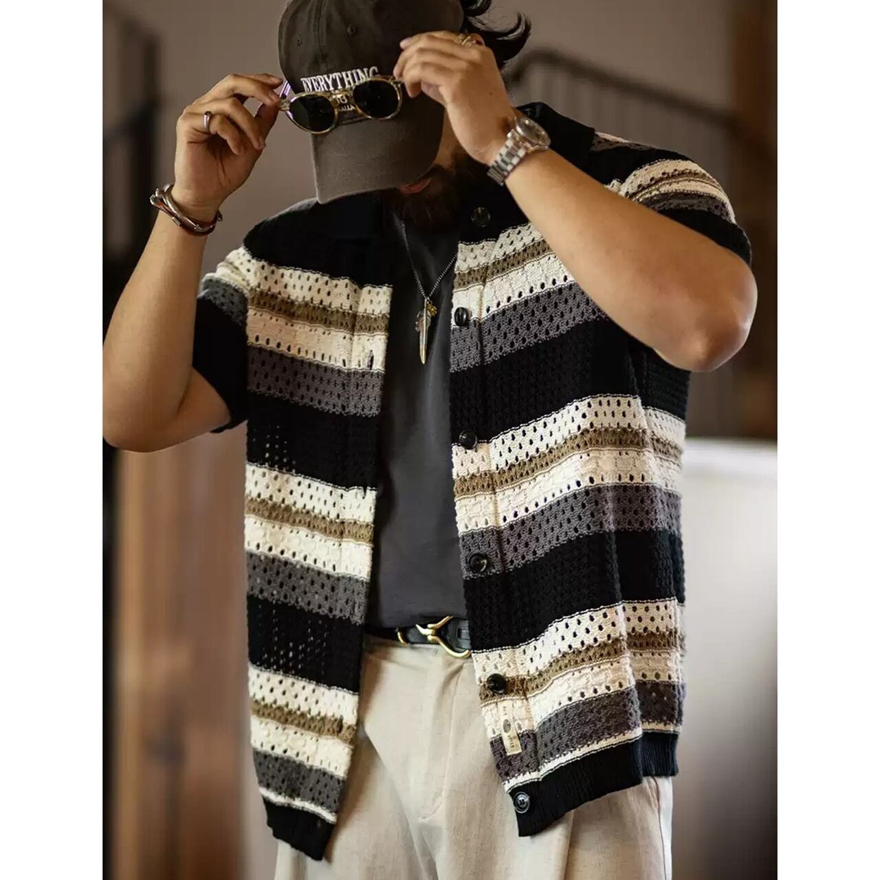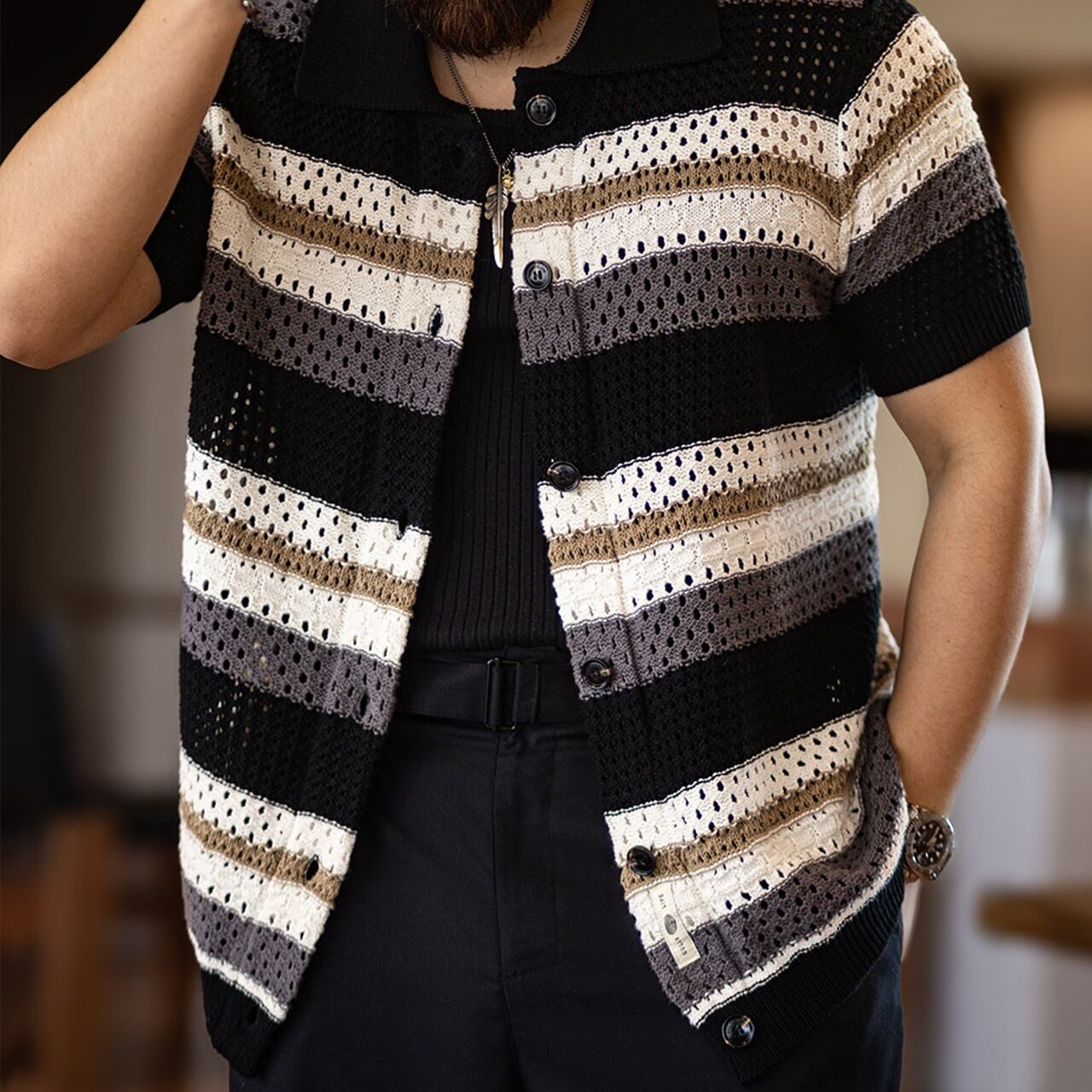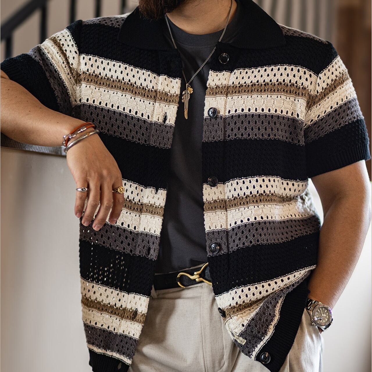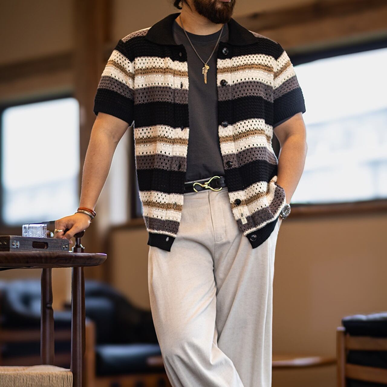 ボーダーニット半袖カーディガン 260128